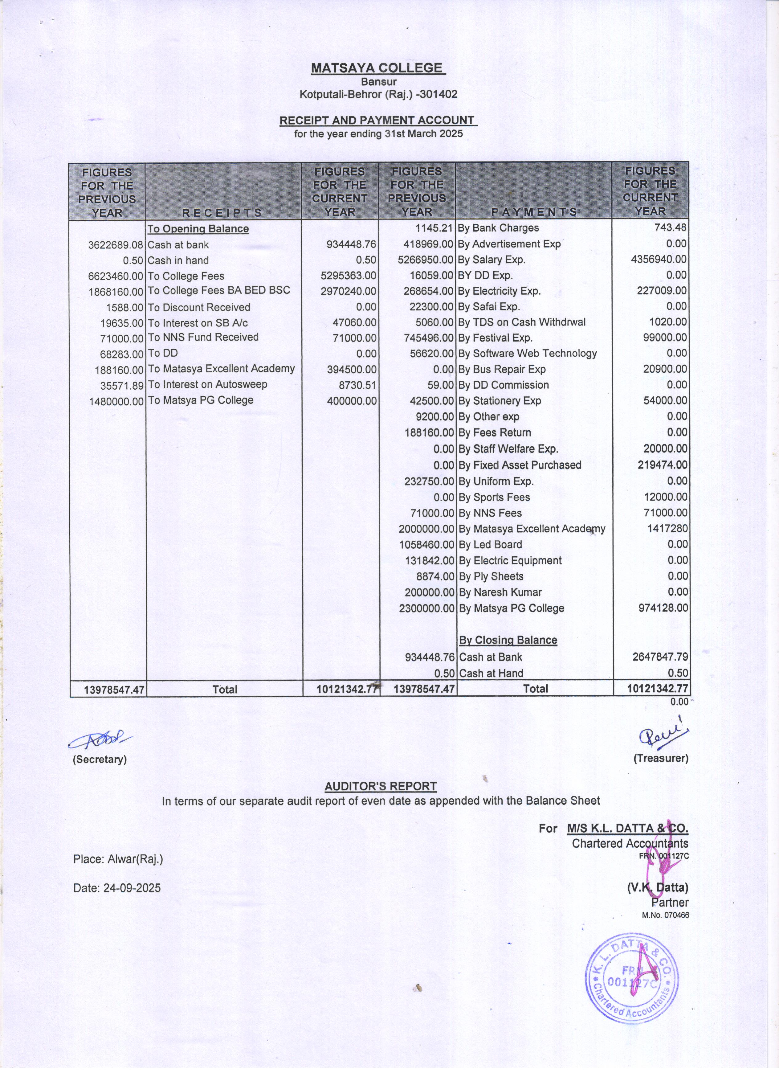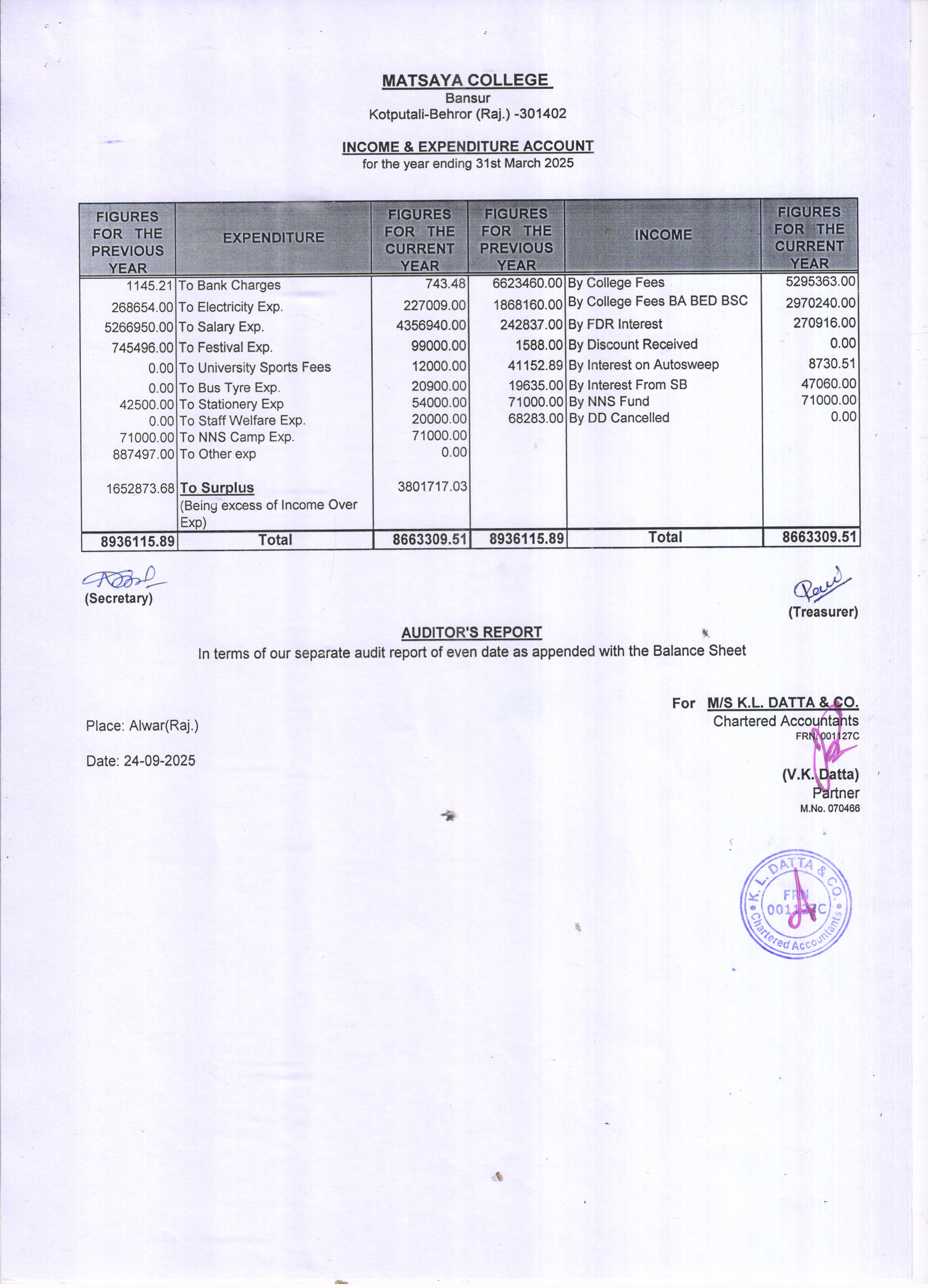 Vision To Blossom as one of the Leading and Most Preferred Institutes with earnest endeavors to enhance. Its quality in imparting excellent education- vocational competitive to the highest academic standards with full devotion and dedication. Mission To Nurture, Nourish and Chisel our girls into a host of well-shaped individuals - Self-reliant, Self-sufficient and Responsible Citizens, Leading to the upliftment of the society. Matsya PG College is one of the largest constituent college of the University of Rajastha . This co-educational Institute offers education in all the three streams - arts, science and commerce, and is located on the near Narayanpur Road, Nopla Wali, Bansur, Alwar. The College has been ranked amongst the Top-10 Science, Arts and Commerce Colleges of Alwar several times in the last decade or so. An institution with academicians imparting education in different fields, the College today has a reputation for performance in academics, sports and extra curricular activities. Through its regular curriculum and its various other extracurricular and co-curricular activities, the college ensures complete development of the body, mind and the soul while enshrining traditional Indian values in each of its students. The college was founded by the Matsya Excellent Academic Society (MEAS) on July 20, 2006, a pioneer in the field of education. It is today one of the lights in the Matsya Excellent Academic Society of over 6 institutions and one of the largest constituent college of Rajasthan University. As of today, in excess of 5000 students on its rolls interact here with scholars of eminence on its faculty. The College has completed 8 years in imparting higher education. It has made contribution to Society in terms of producing dignitaries, scholars, intellectuals and sports persons who served different domains not only in our own country but even at international levels